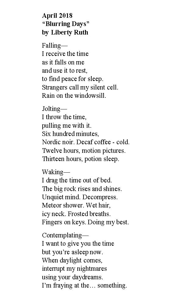 Poetry: “Blurring Days” by Liberty RPosted onNovember 16, 2019November 16, 2019 Poetry published as images to preserve author’s original formatting.
