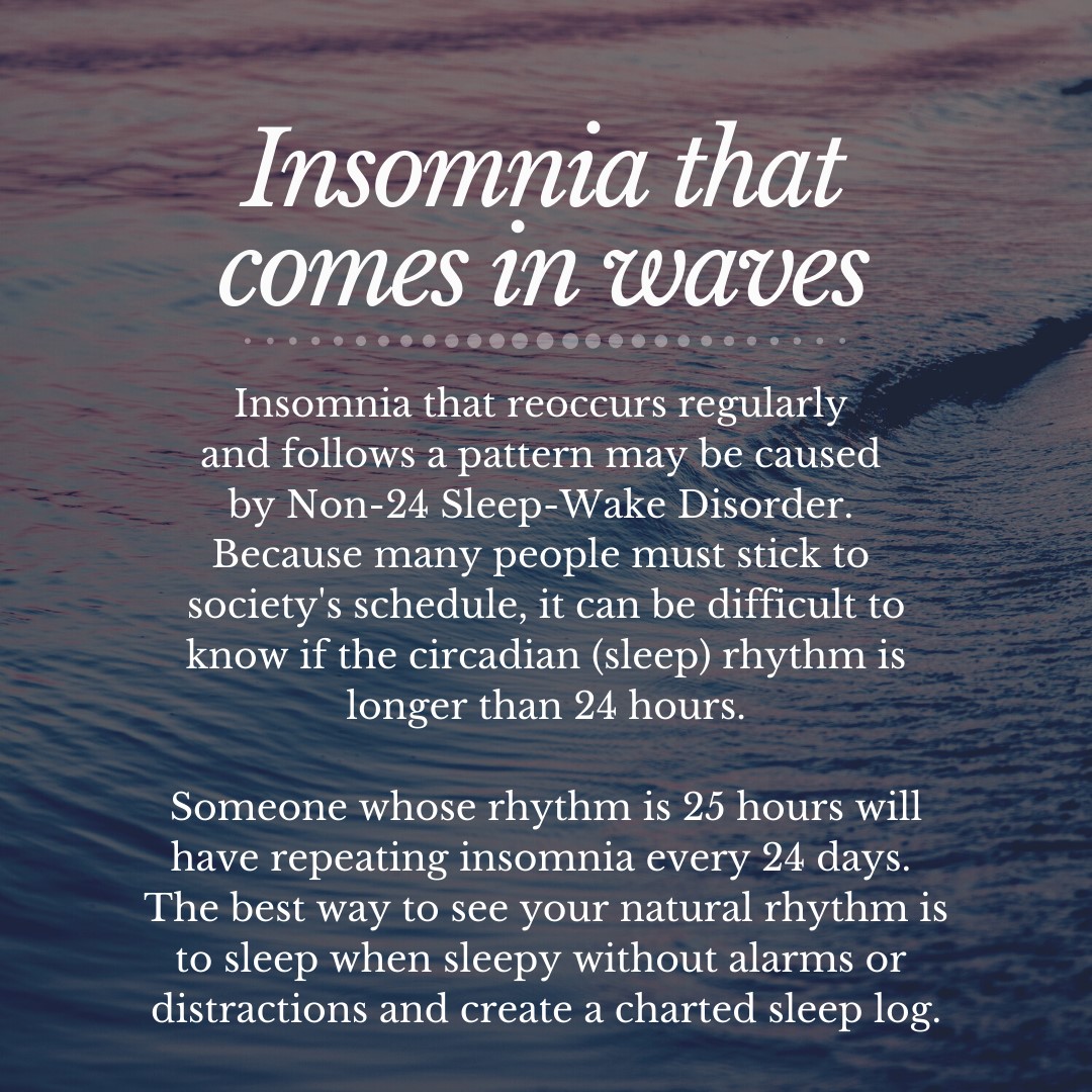 The primary sign is a sleep–wake cycle longer than 24 hours, usually averaging 25-26 hours. In someone who is forcing their sleep with alarms, this may look like cyclical insomnia or insomnia that comes in waves. When your circadian rhythm is not aligned with your schedule, you would have insomnia and symptoms of sleep deprivation, but when it is aligned, you would sleep fine.