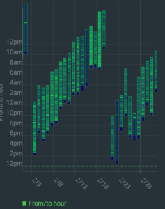 This graph is an example of a Non-24 sleep pattern with a semi-predictable forward shift. The date is horizontal and the sleep time is vertical. It shows a semi-predictable pattern and then shows the patient forcing themselves to stay awake on 2/25; then, the pattern tries to correct itself to the patient’s abnormal (Non-24) circadian rhythm.